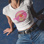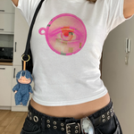 - 90s-style baby tee with a boxy silhouette and slight cropped hem