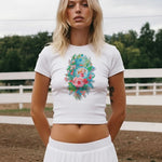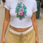 - 90s-style baby tee with a boxy silhouette and slight cropped hem