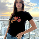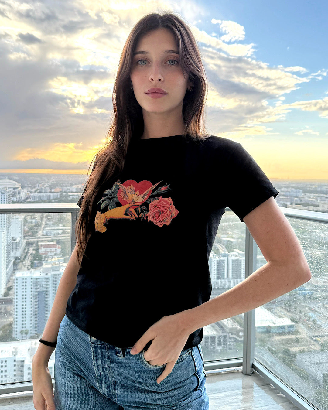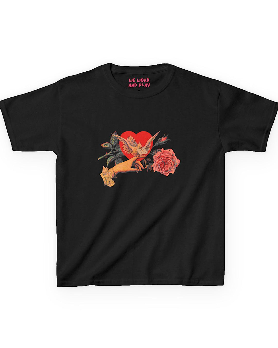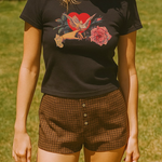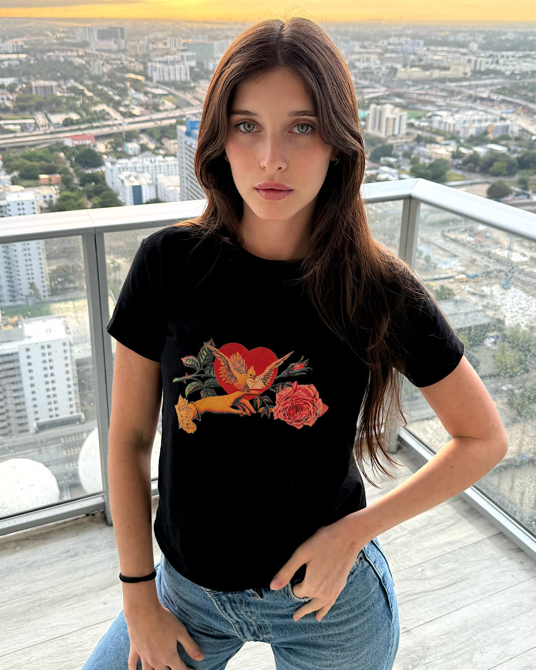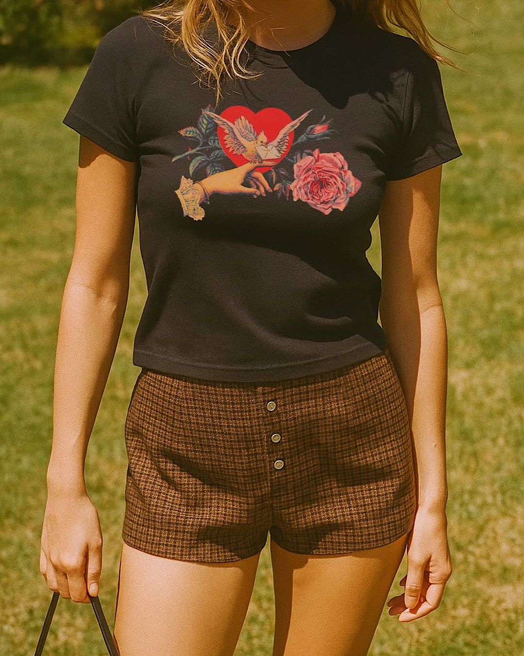 - 90s-style baby tee with a boxy silhouette and slight cropped hem