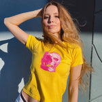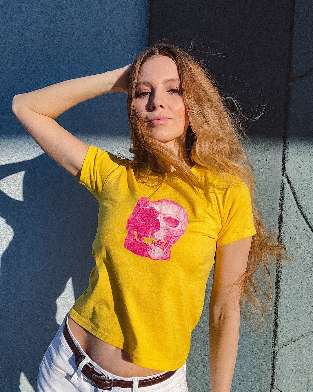 - 90s-style baby tee with a boxy silhouette and slight cropped hem