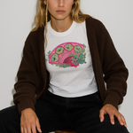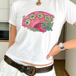 - 90s-style baby tee with a boxy silhouette and slight cropped hem
