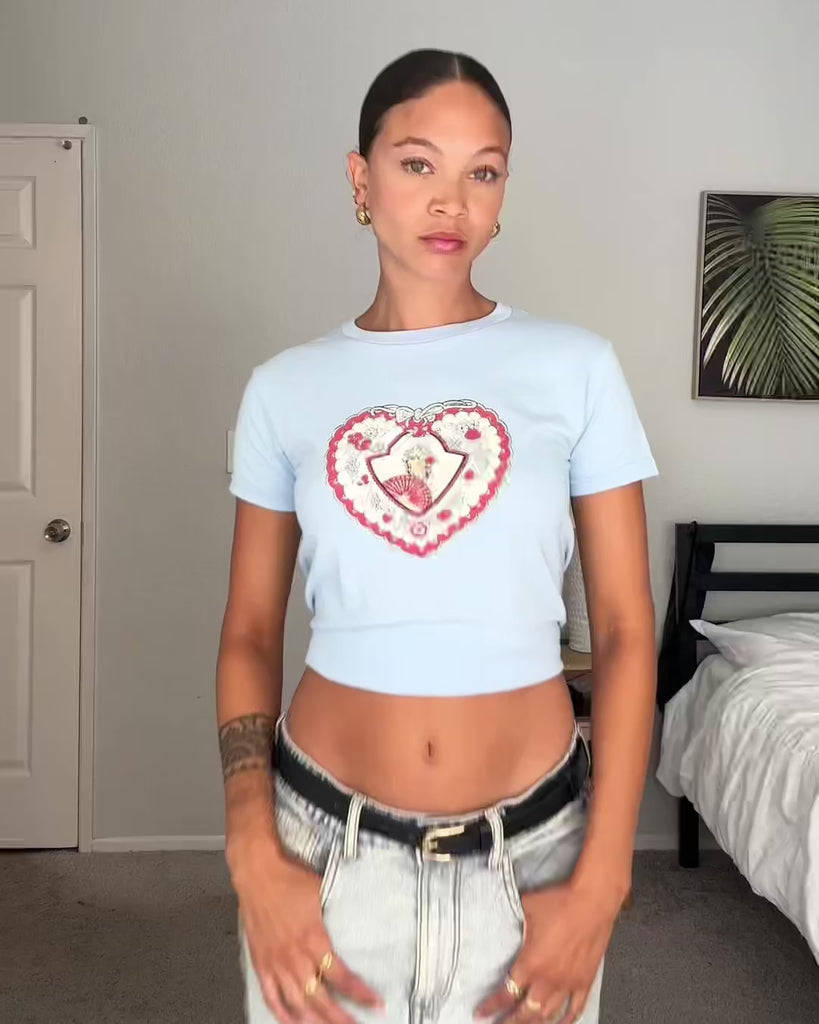 - 90s-style baby tee with a boxy silhouette and slight cropped hem